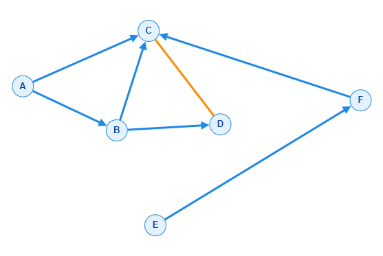 graph = {'A':['B','C'],'B':['C','D'],'C':['D'],'D':['C'],'E':['F'],'F':['C']}