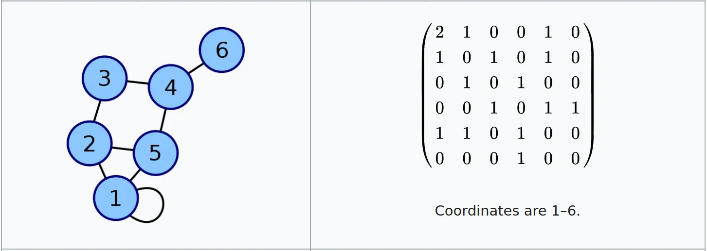 On représente les liens entre les n sommets du graphe par une matrice de dimension n dont l’élément non diagonal aij est le nombre d’arêtes (ou son poids pour un graphe pondéré) liant le sommet i au sommet j.